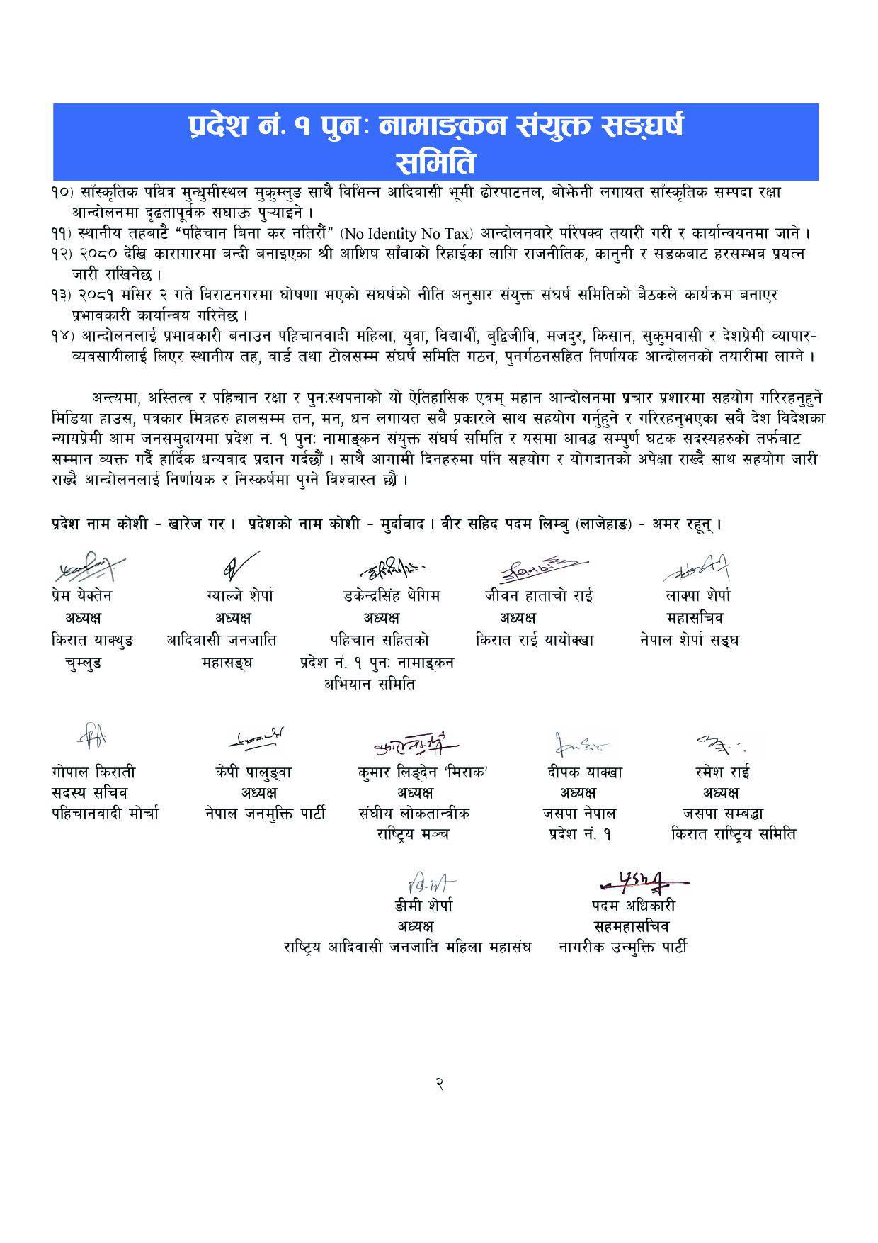 सोमबार विराटनगरमा प्रेसमिट गर्दै संघर्ष समितिले नयाँ चरणको आन्दोलनलाई शान्तिपूर्ण थप शसक्त बनाउने लाने जनाएको छ । पहिचान पक्षधर शक्तिहरुसँग थप छलफल वार्ता गर्दै प्रदेश सरकार र प्रदेशका ८१+३ लाई रोक्ने, कोशी लेखिएका कागजातहरुलाई हटाउने कार्यक्रमहरुलाई निन्तरता दिने समेत विज्ञप्ति मार्फत जनाइएको छ । यसैगरी संघर्ष समितिले २ गते नयाँ चरणको आन्दोलनको खाका समेत प्रस्तुत गरेको छ ।