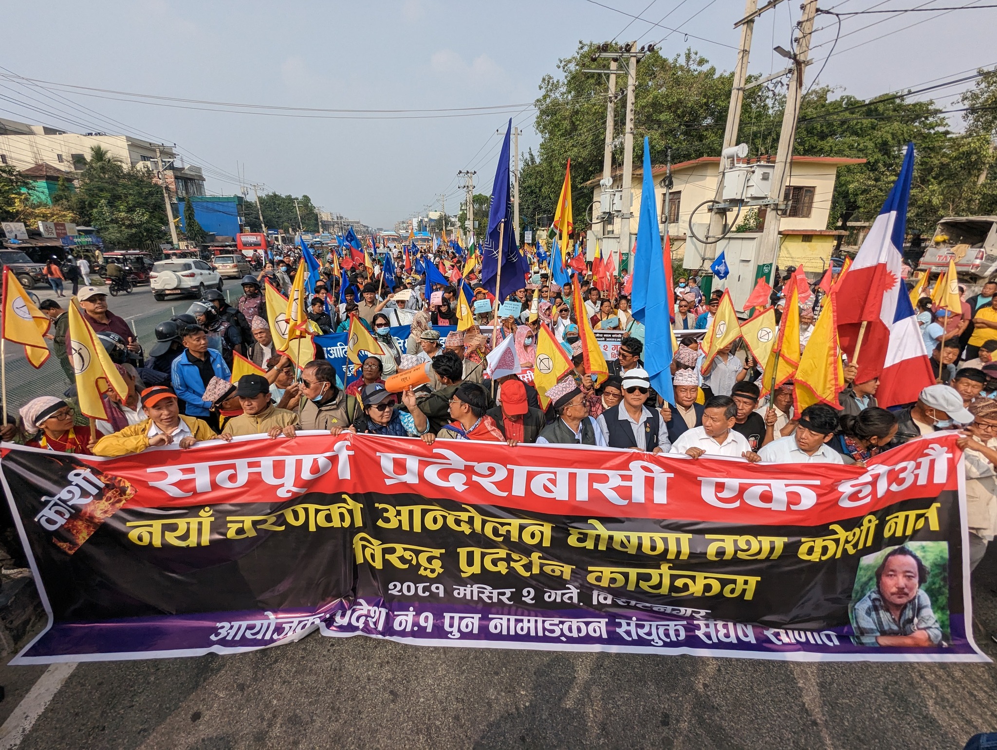 विराटनगर, ४ मंसिर । पहिचान पक्षधरहरूले कोशी प्रदेशको नाम पहिचानको आधारमा राख्नुपर्ने मागसहित विराटनगरमा विरोध आइतबार प्रदर्शन गरेका छन् । विराटनगरमा प्रदेश नं. १ पुन नामाङकन संयुक्त संर्घष समितिको आयोजनामा ¥याली सहित विरोध प्रदर्शन भएको हो ।