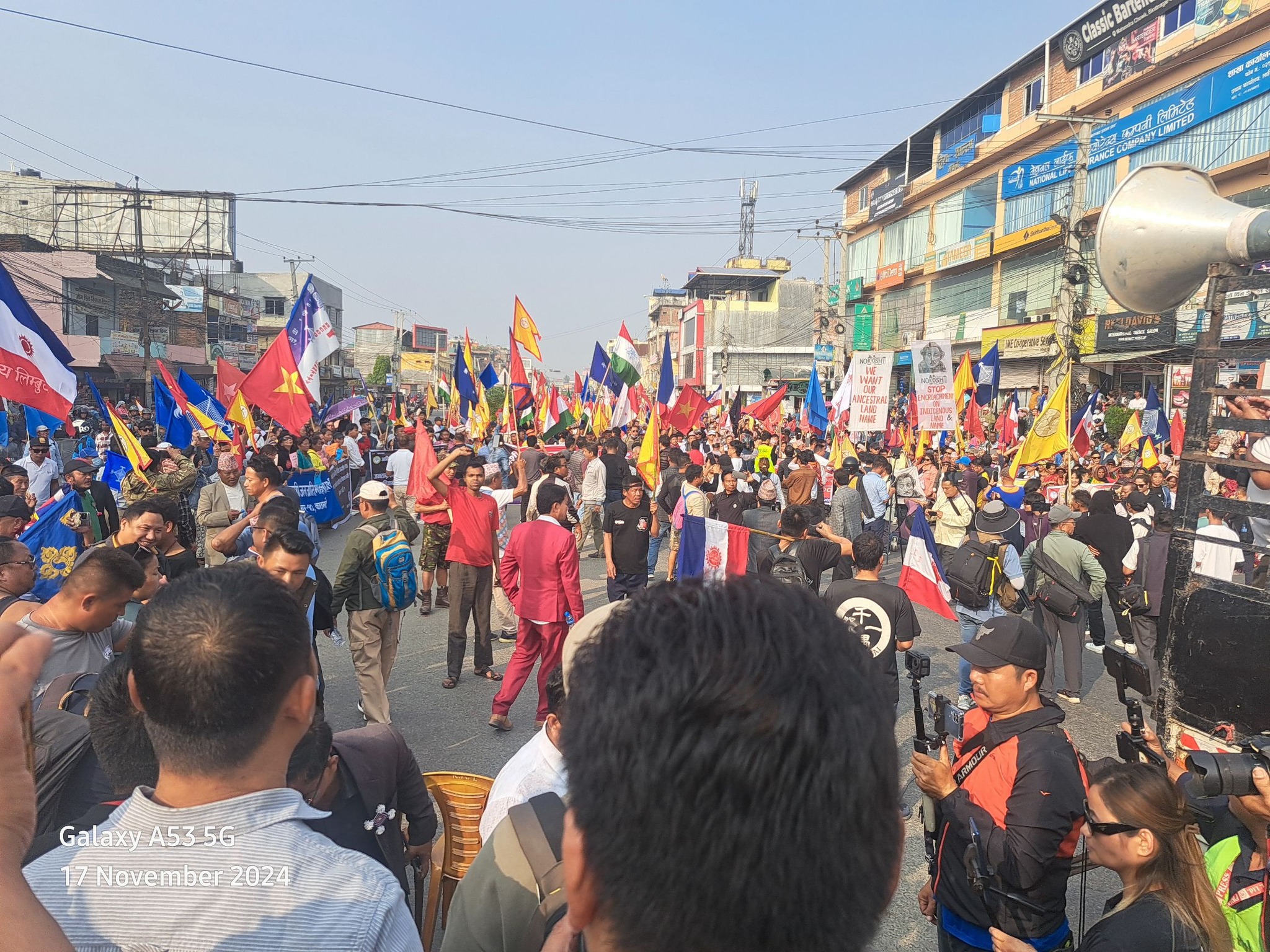 विरोध प्रदर्शनलाई सम्बोधन गर्दै नेकपा माओवादी केन्द्रकी उपाध्यक्ष पम्फा भुषालले संविधानमाथि विभिन्न नाममा आक्रमणको प्रयास भएकाले यसको रक्षा र थप उपलब्धिका लागि एकजुट हुनुको विकल्प नभएको बताए ।