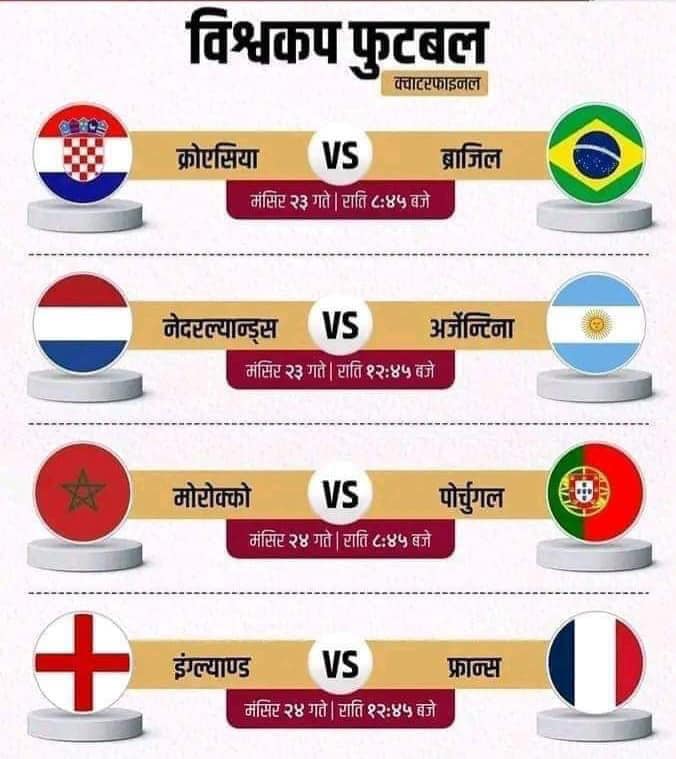 काठमाडौं, २३ मंसिर । कतारमा जारी फिफा विश्वकप फुटबल २०२२ को आज (शुक्रबार)बाट क्वाटरफाइनलका खेलहरु सुरु हुँदैछ । कतार विश्वकप अन्तर्गत शुक्रबार दुई क्वाटरफाइनल खेलहरु हुनेछन् ।