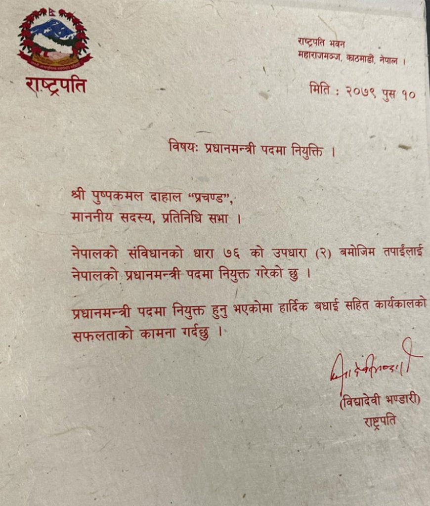काठमाडौं, ११ पुष । नेकपा माओवादी केन्द्रका अध्यक्ष पुष्पकमल दाहाल ‘प्रचण्ड’ प्रधानमन्त्रीमा नियुक्त भएका छन् । आइतबार साँझ राष्ट्रपति विद्यादेवी भण्डारीले प्रचण्डलाई प्रधानमन्त्रीमा नियुक्त गरेकी हुन् ।