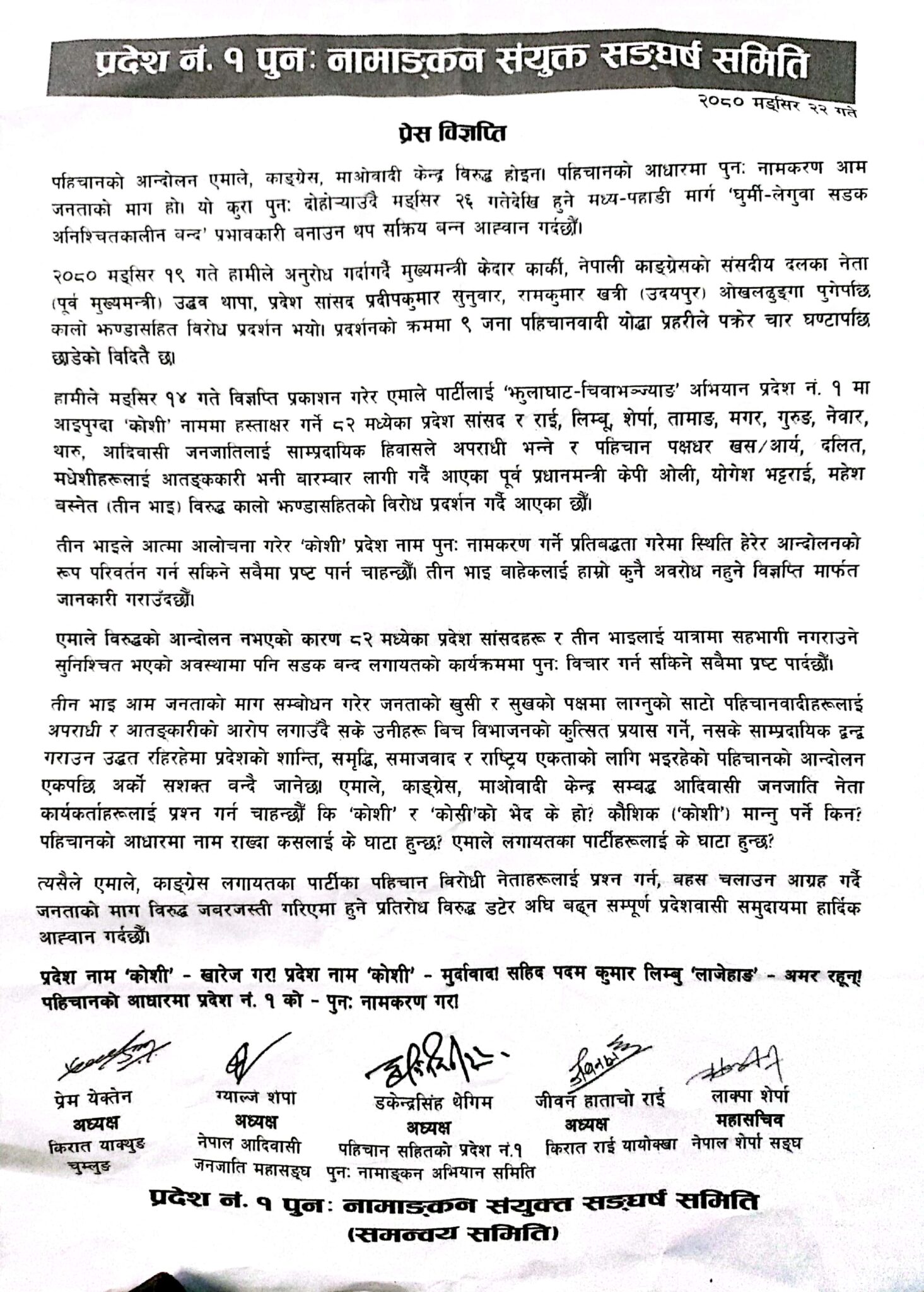 प्रदेश नं. १ पुनः नामाङ्कन संयुक्त सङ्घर्ष समिति ‘कोशी’ नाममा हस्ताक्षर गर्ने ८२ मध्येका प्रदेश सदस्य र राई, लिम्बू, शेर्पा, तामाङ, मगर, गुरुङ, नेवार, थारु, आदिवासी जनजातिलाई साम्प्रदायिक हिवासले अपराधी भन्ने र पहिचान पक्षधर खस÷आर्य, दलित, मधेशीहरूलाई आतङ्ककारी भनी बारम्बार गाली गर्दै आएका पूर्व प्रधानमन्त्री ओली, योगेश भट्टराई, महेश बस्नेत (तीन भाई) विरुद्ध कालो झण्डासहितको विरोध प्रदर्शन गर्दै आएका छौं– बिज्ञप्तिमा उल्लेख छ ।