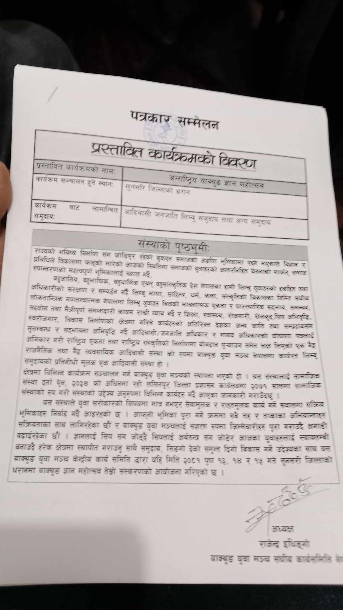 धरानका संचारकर्मीहरुको बाकुलो उपस्थिति रहेको उक्त सम्मेलनमा अध्यक्ष इधिङगोले याक्थुङ युवाहरुलाई लक्षित गर्दै विभिन्न विषयहरुमा कार्यपत्र प्रस्तुत गरिने बताए । प्रोफेसर डा. महेन्द्र लावती, मुन्धुम विद डिबी आङबुङ, प्रा. तथा कियाचू अध्यक्ष प्रेम एक्तेन, प्रा. मधुराज केरुङ लगायत बौद्धिक व्यक्तित्वहरुले कार्यपत्र पेश गर्ने उनले बताए ।