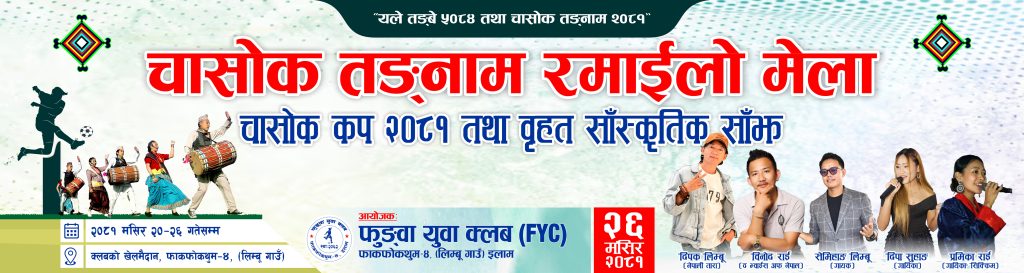 दमक, २० मंसिर । इलामको फाकफोकथुम ४स्थित लिम्बुगाउँमा मंसिर २५ र २६ गते चासोक तङ्नाम रमाईलो मेला लाग्ने भएको छ । विगत १७ बर्षदेखि निरन्तर लाग्दै आईरहेको उक्त मेलामा आज(बिहीबार)बाट चासोक कप २०८१ नकआउट फूटबल...